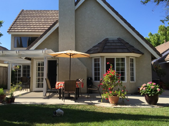 The weather on this day is simply glorious! At 4:15pm is it a perfect 75 degrees. Where I sit, I see a very blue sky and lots of green in the backyard. Thanks to the weekly gardener, this backyard is lovely. The Lily of the Nile flowers are fading, as is the hydrangea, but the bougainvillea has fresh flowers and some roses are ready to open up.